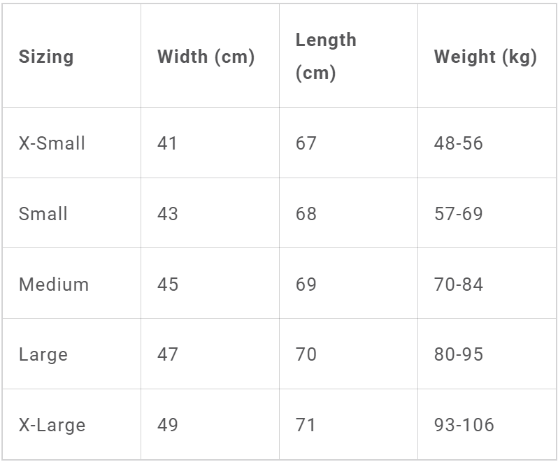 | Sizing | Width (cm) | Length (cm) | Weight (kg) |